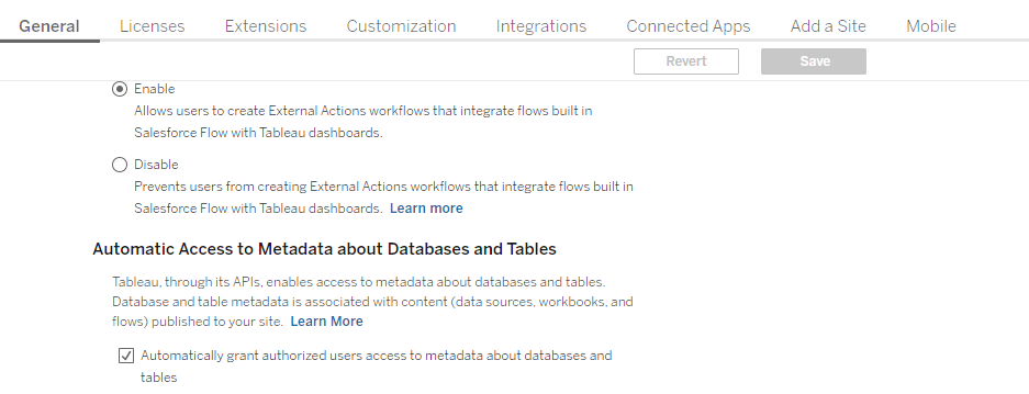 1. Check in the Tableau Settings in the General tab that `Automatic Access to Metadata about Databases and Tables` is enabled in your organization.