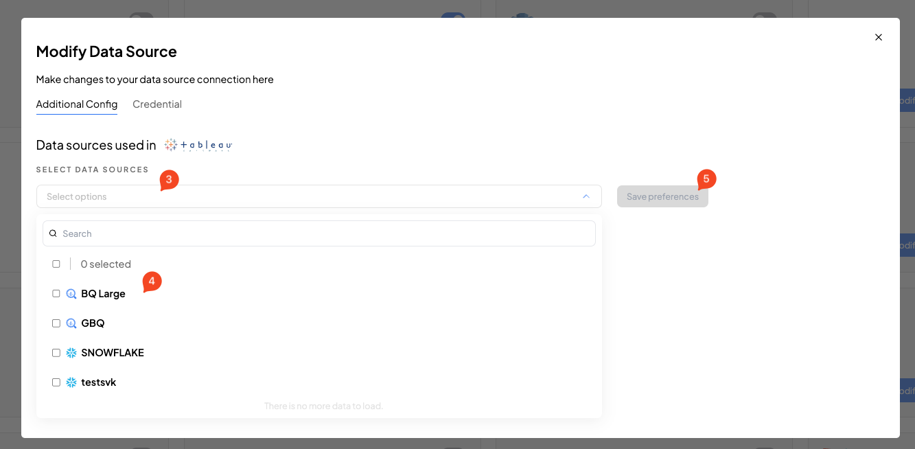 3. Click on the Dropdown for Select Data Sources. Select the data sources (4) that your Tableau objects are referencing to and click on `Save preferences` (5).