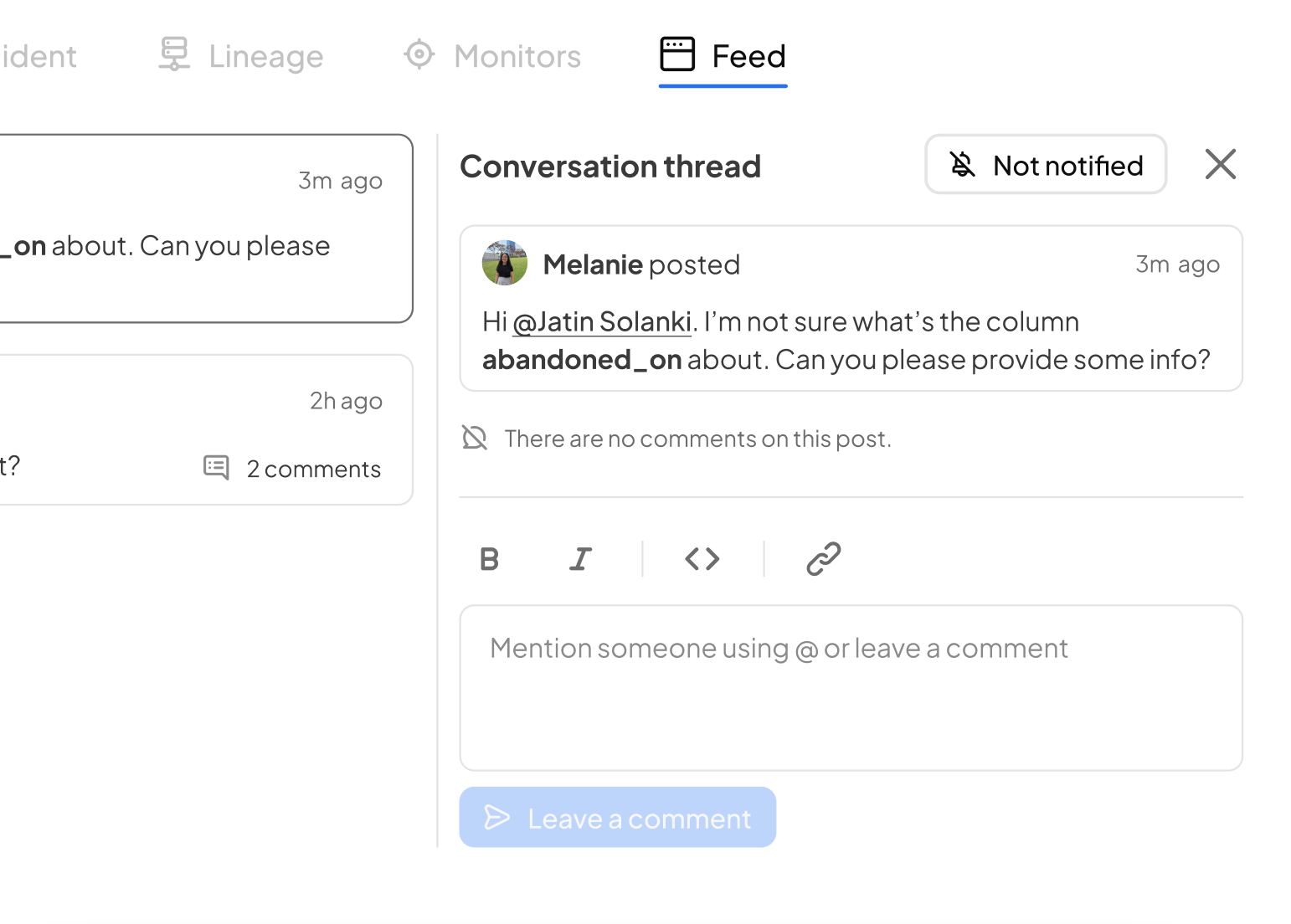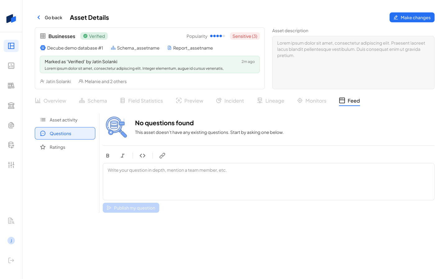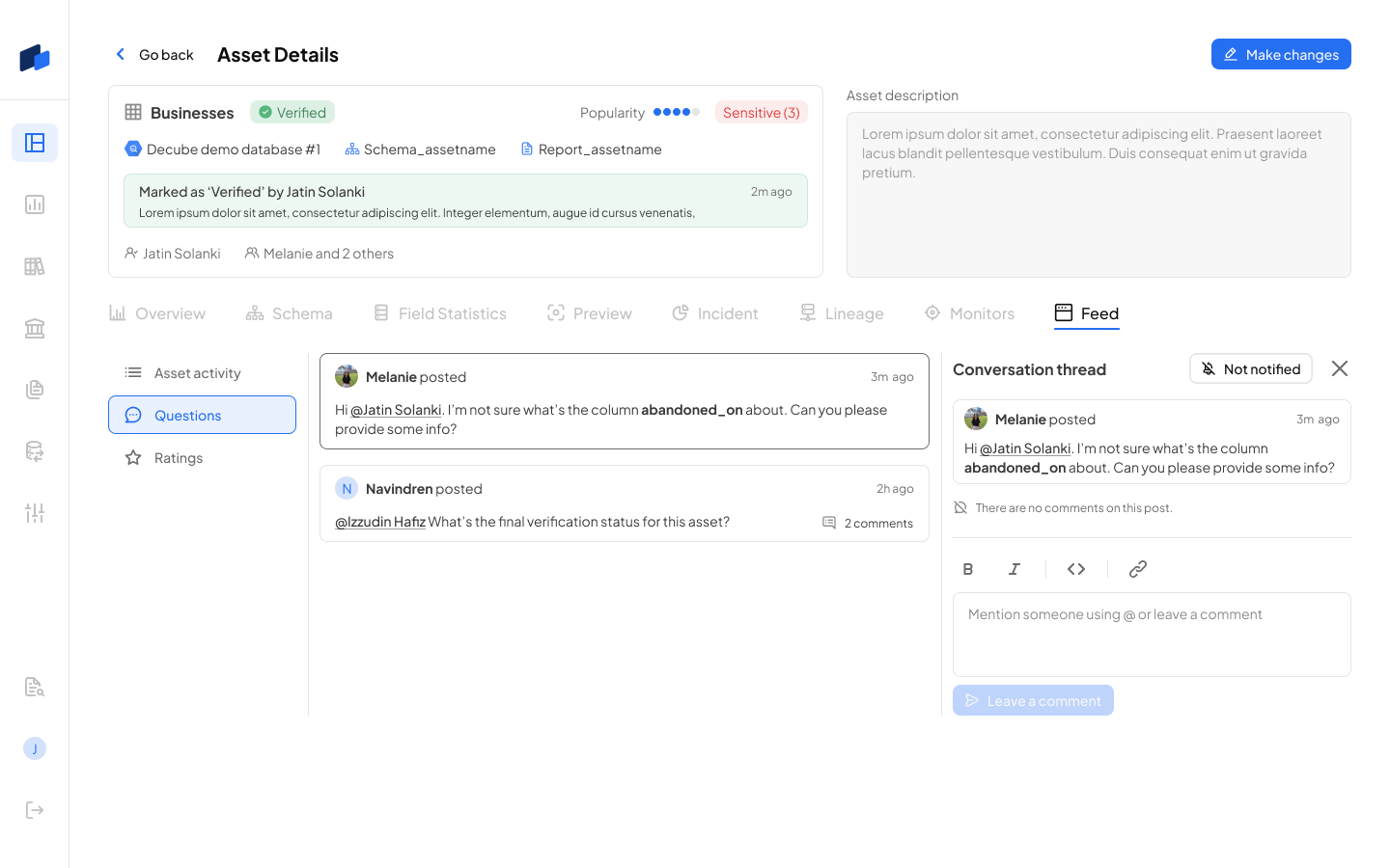 Want to ask a question to the asset owners directly without going to Slack or email? You can now do it within each Asset's **Feed**.