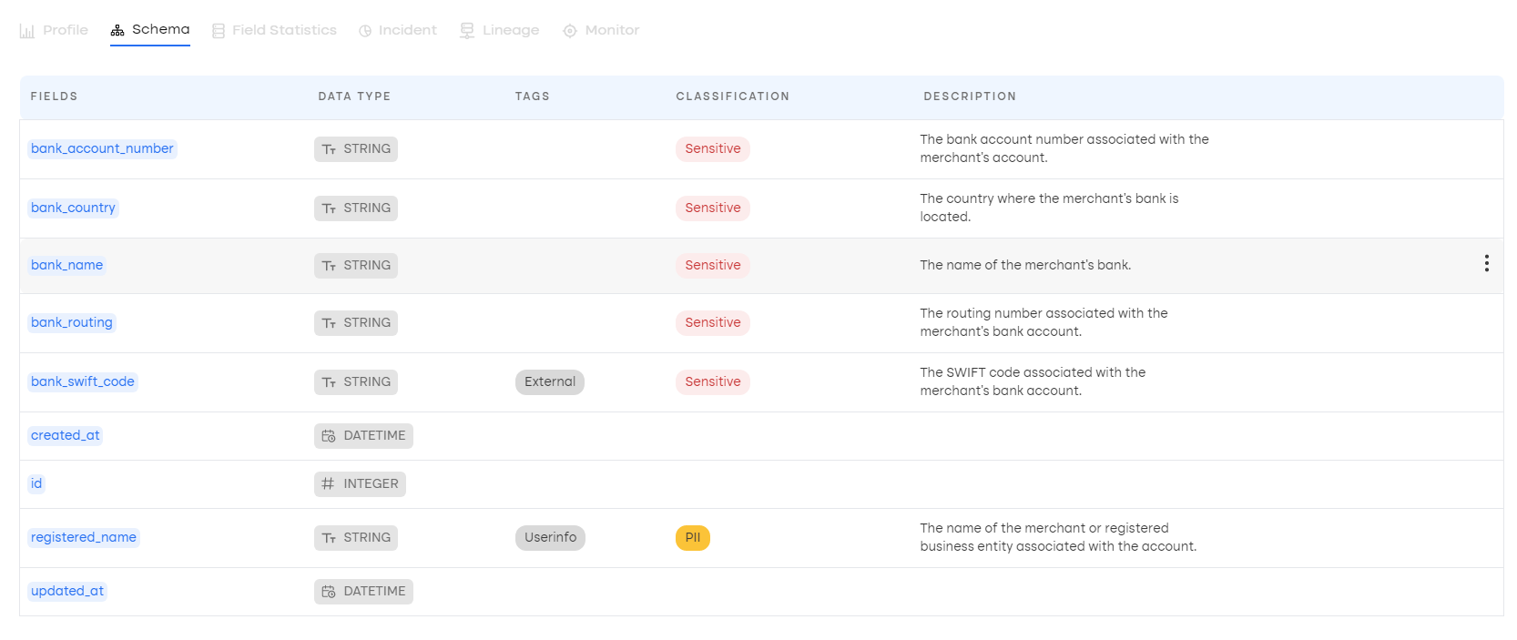 Add tags and classifications to your tables so that others in your team can understand the purpose and usage of each column within your data source. This functionality is available in the Schema tab within the Asset Details section.