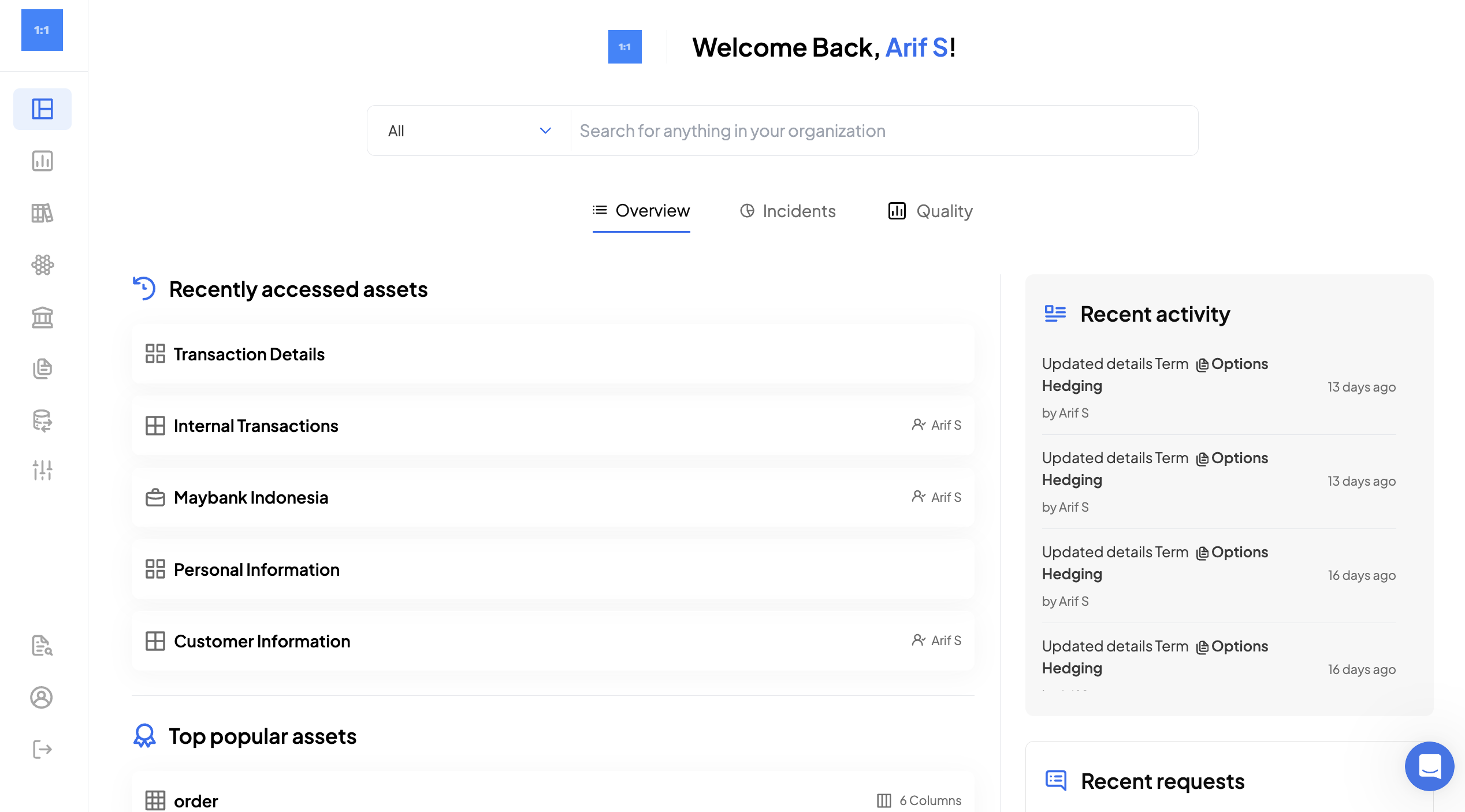 * **Recent Activity:** Shows the recent activity of assets you have access to, including new data products, updates to the glossaries and others.