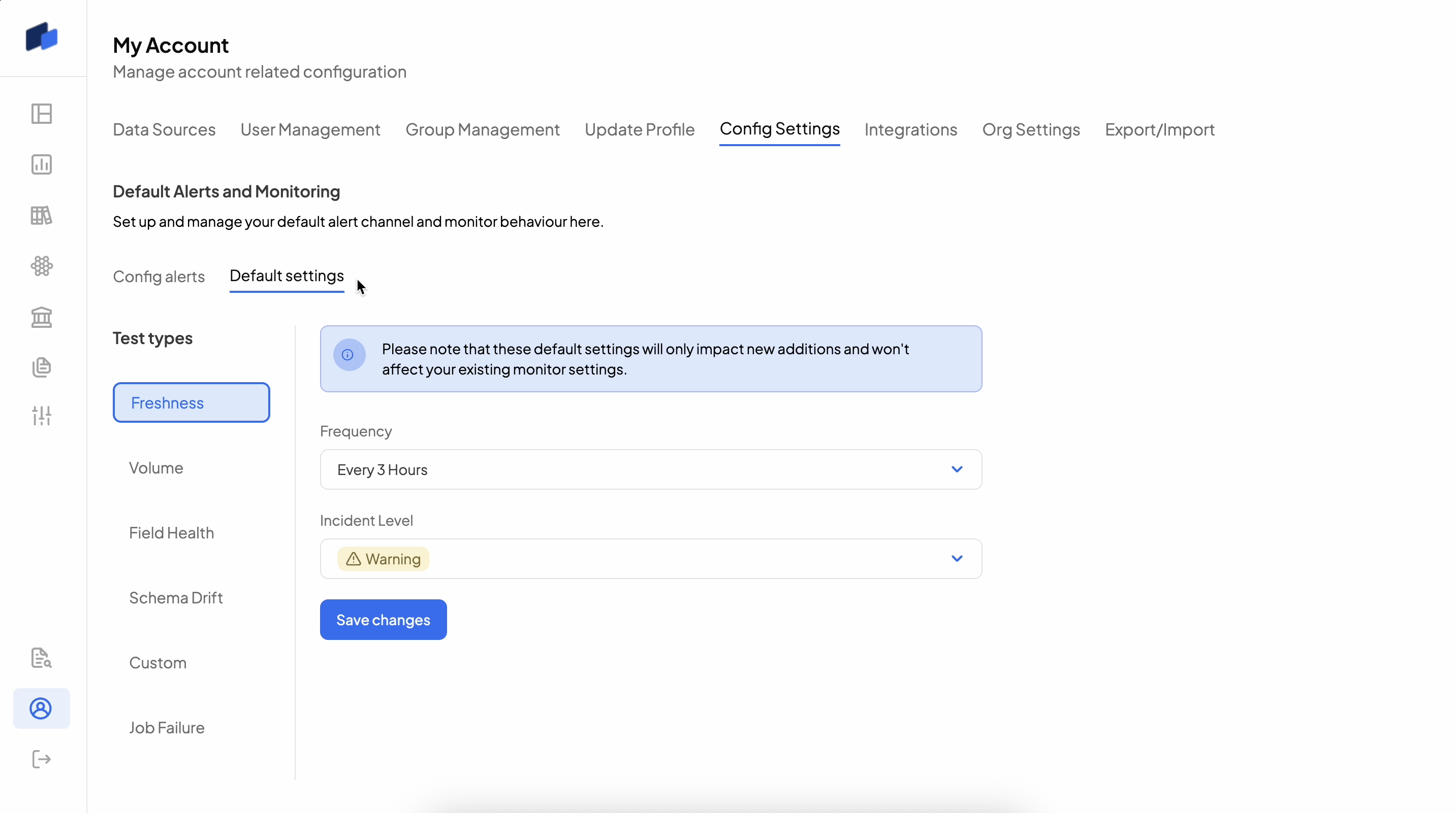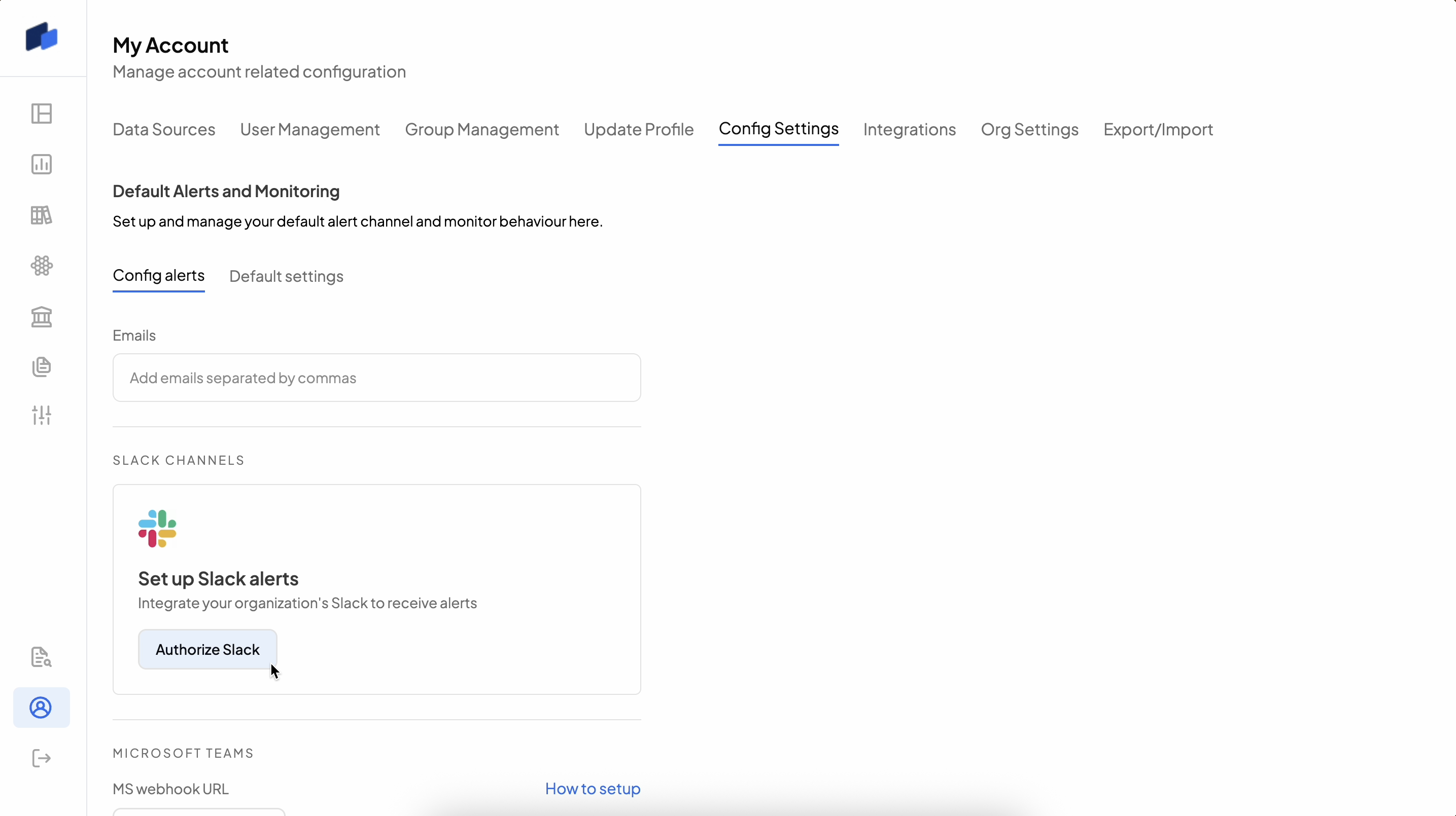 To set up default alert channels like Emails and Slack, go to the "My Account" page and choose the "Config Settings" tablist.