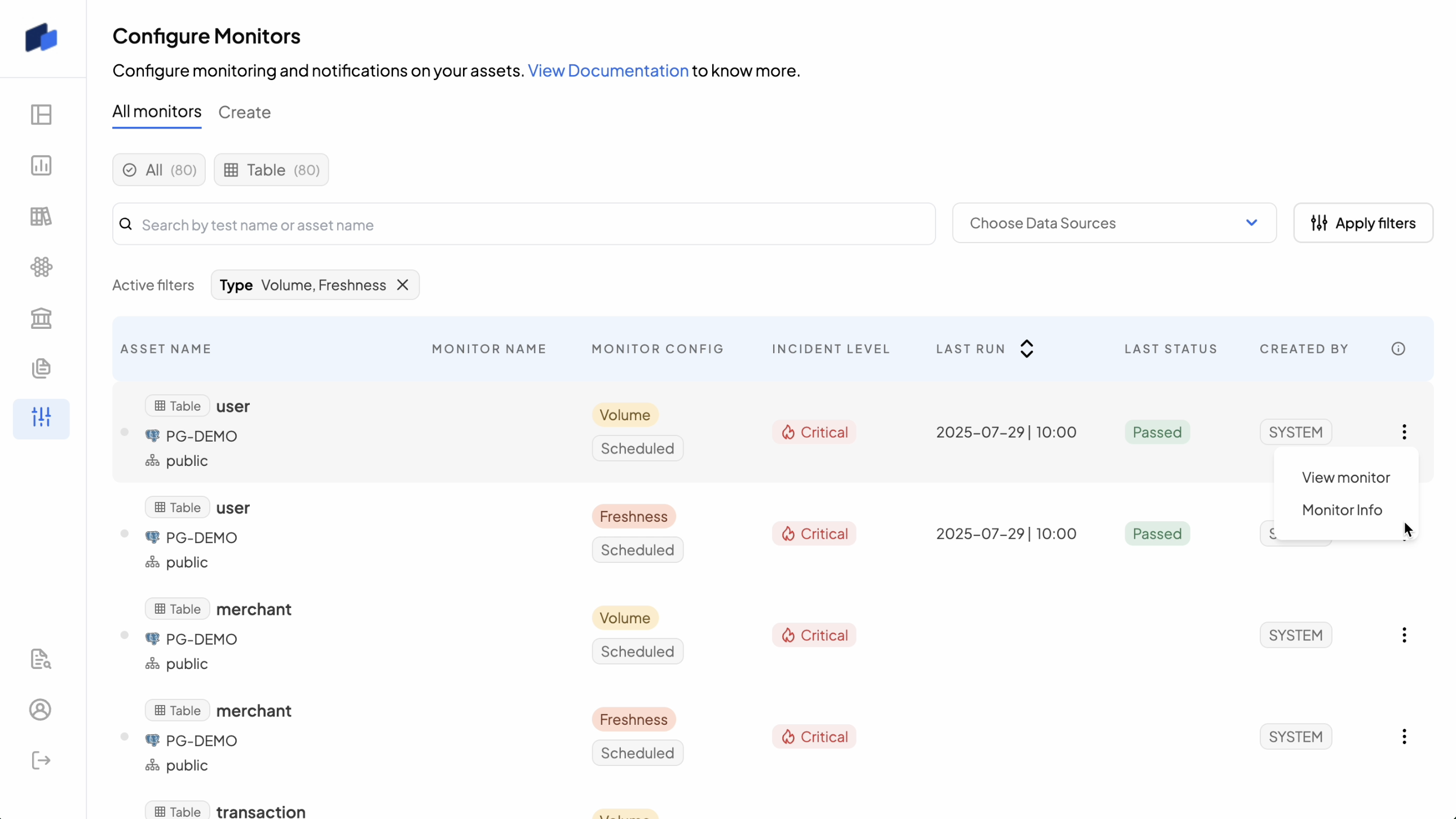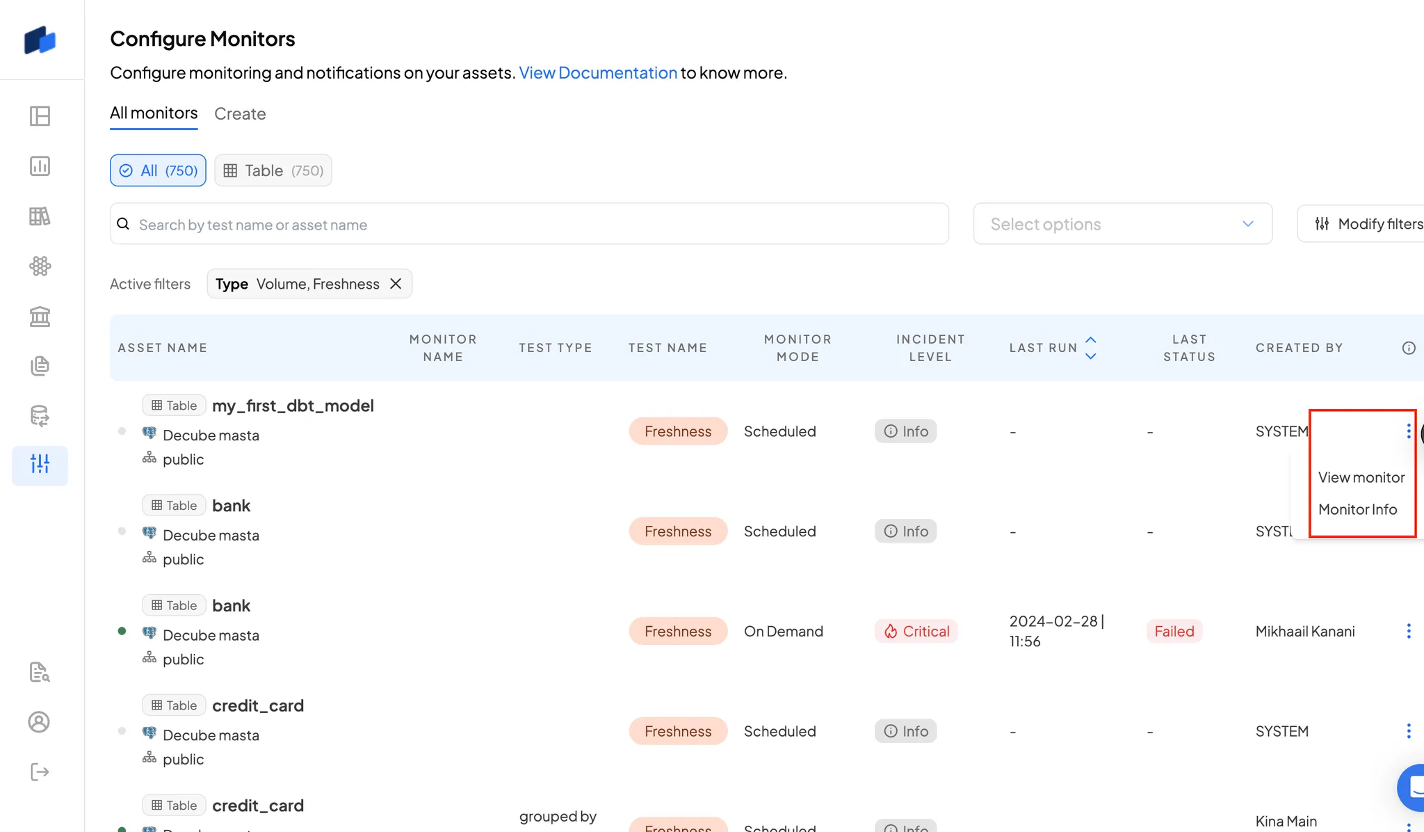 1. **Start Here**: [Freshness & Volume](https://docs.decube.io/data-quality/how-to-set-up-monitors/set-up-freshness-and-volume-monitors) for critical tables