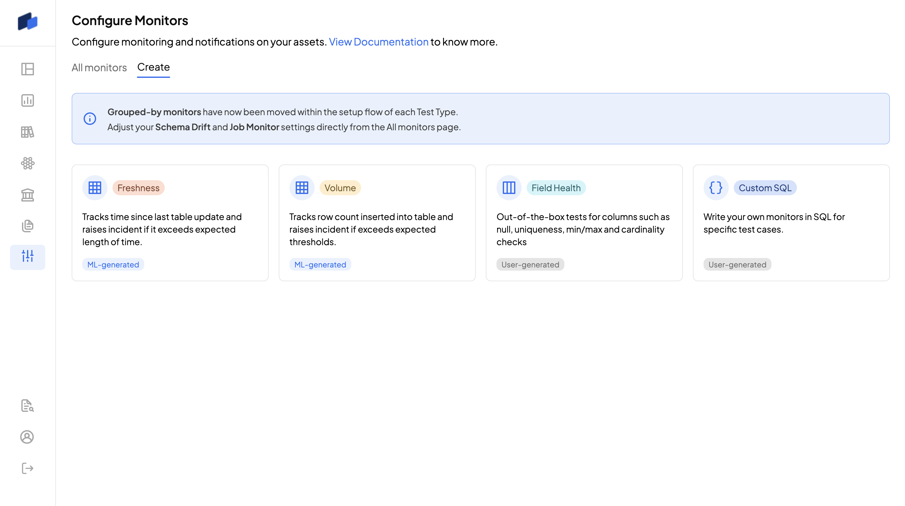 **Recent Update:** Grouped-by monitors are now integrated within each test type setup flow. Schema Drift and Job Failure settings can be adjusted directly from the All Monitors page.