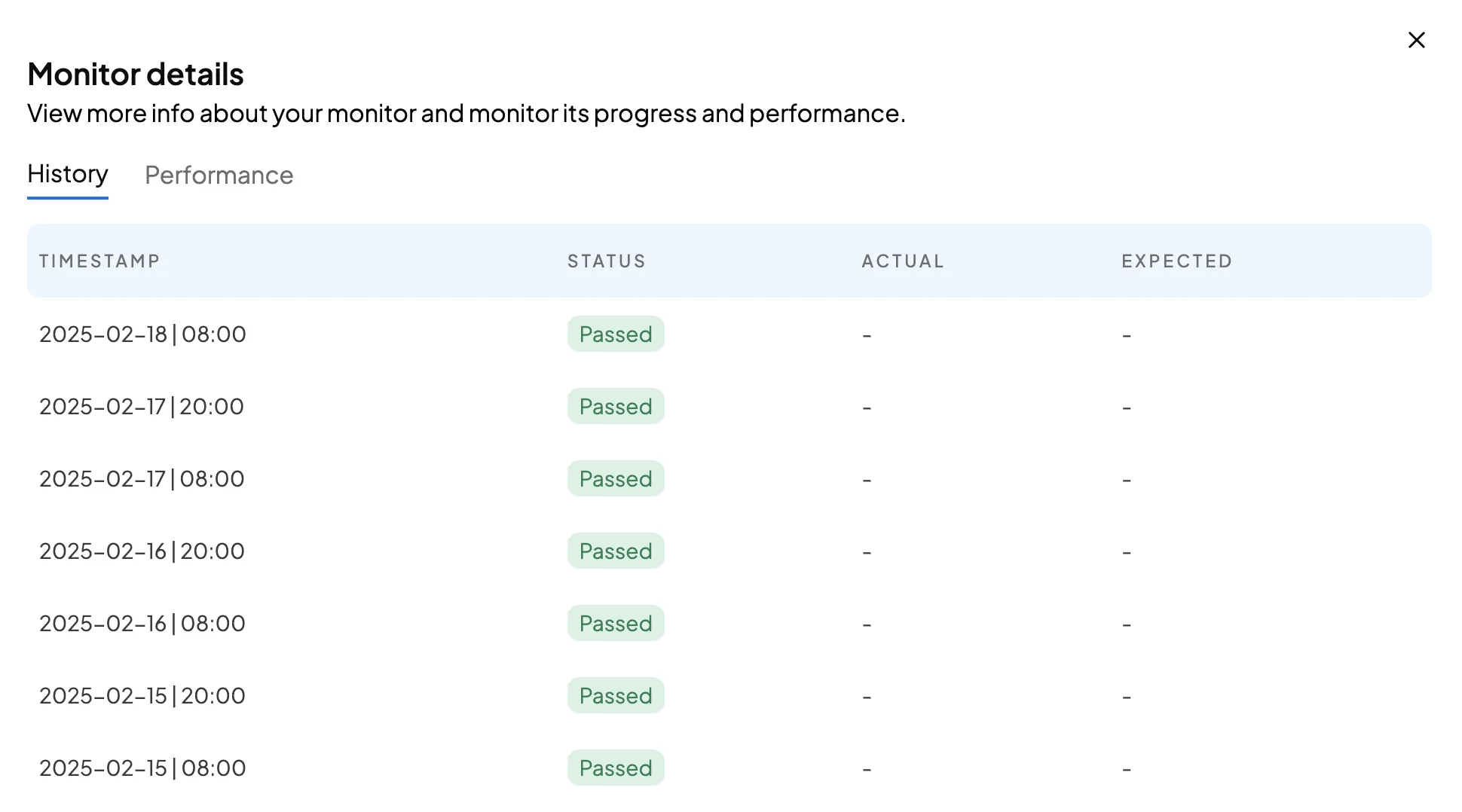 <figure><img src="https://1779874722-files.gitbook.io/~/files/v0/b/gitbook-x-prod.appspot.com/o/spaces%2FTw0qpCVzfrIXqS4FEg4T%2Fuploads%2Fgit-blob-c471a6a3f983b0b8c5f8d2978b00439c2dd7cc07%2Fimage.png?alt=media" alt=""><figcaption><p>Overview of Monitor history</p></figcaption></figure>
