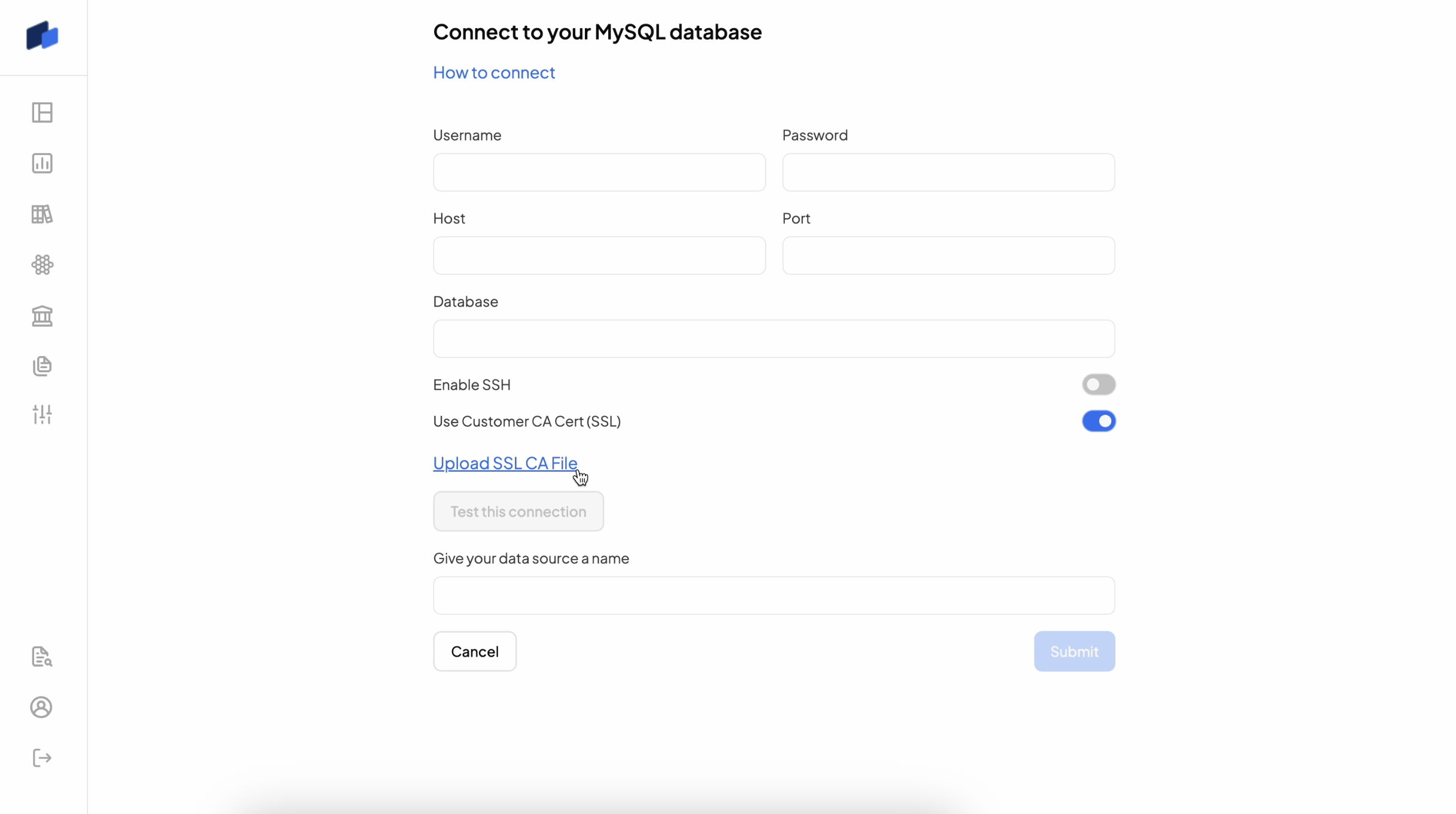 If your database enforces SSL connection, you can provide your own CA Cert file by choosing `Use Customer CA Cert`and uploading a CA Cert.