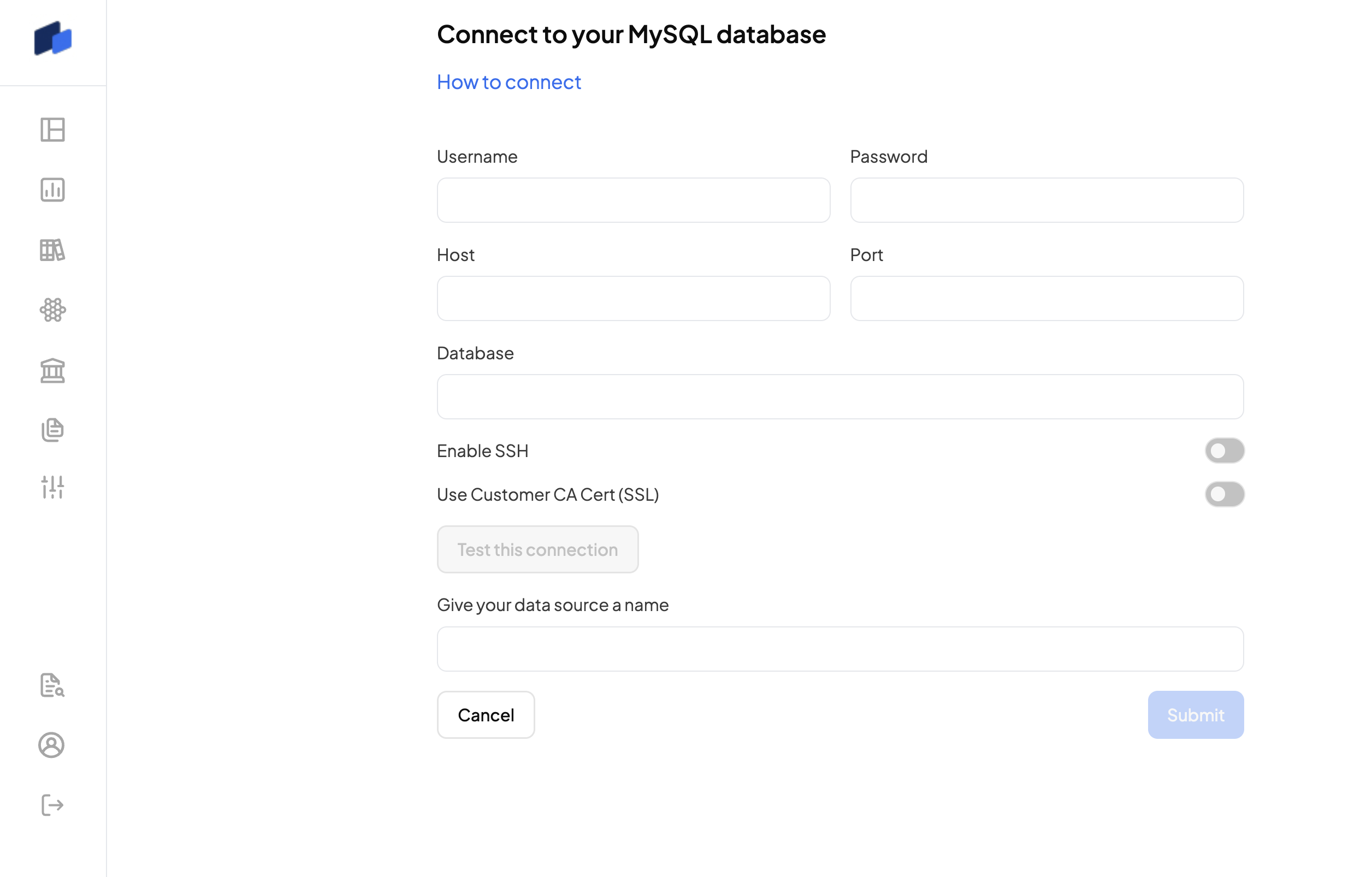 Connecting to decube is as easy as providing us with credentials to your MySQL database. At a minimum, we require