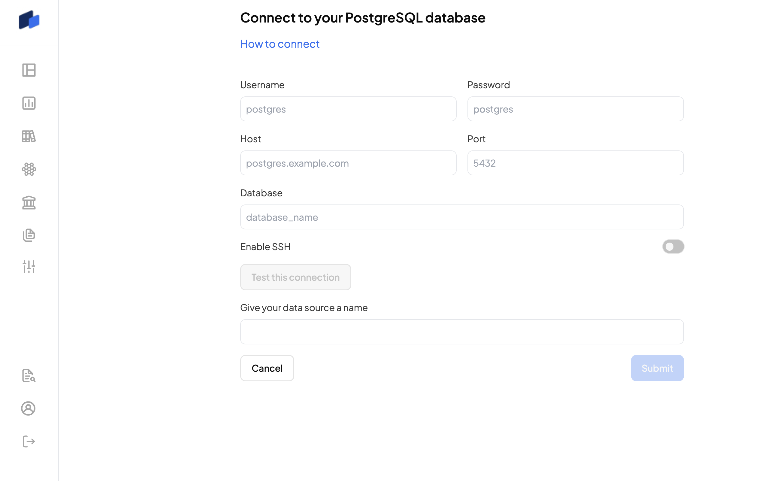 Connecting to decube is as easy as providing us with credentials to your PostgreSQL database. At a minimum, we require: