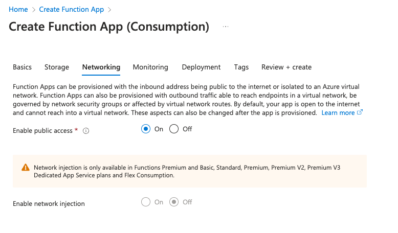 1. See [Azure documentation](https://learn.microsoft.com/en-us/azure/azure-functions/functions-networking-options?tabs=azure-portal) if alternate networking is required
