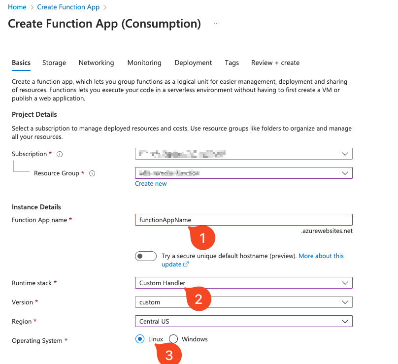 * Create an Azure Function with Custom Handler as the Runtime Stack