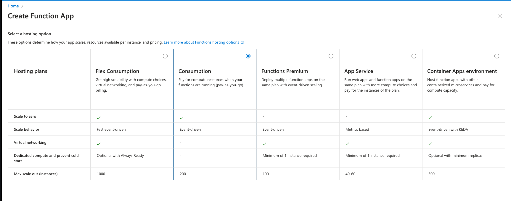 2. Choose either Consumption (recommended), Functions Premium or App Service