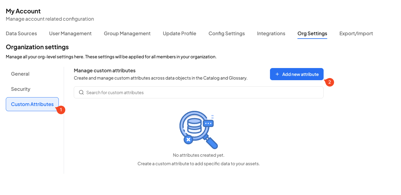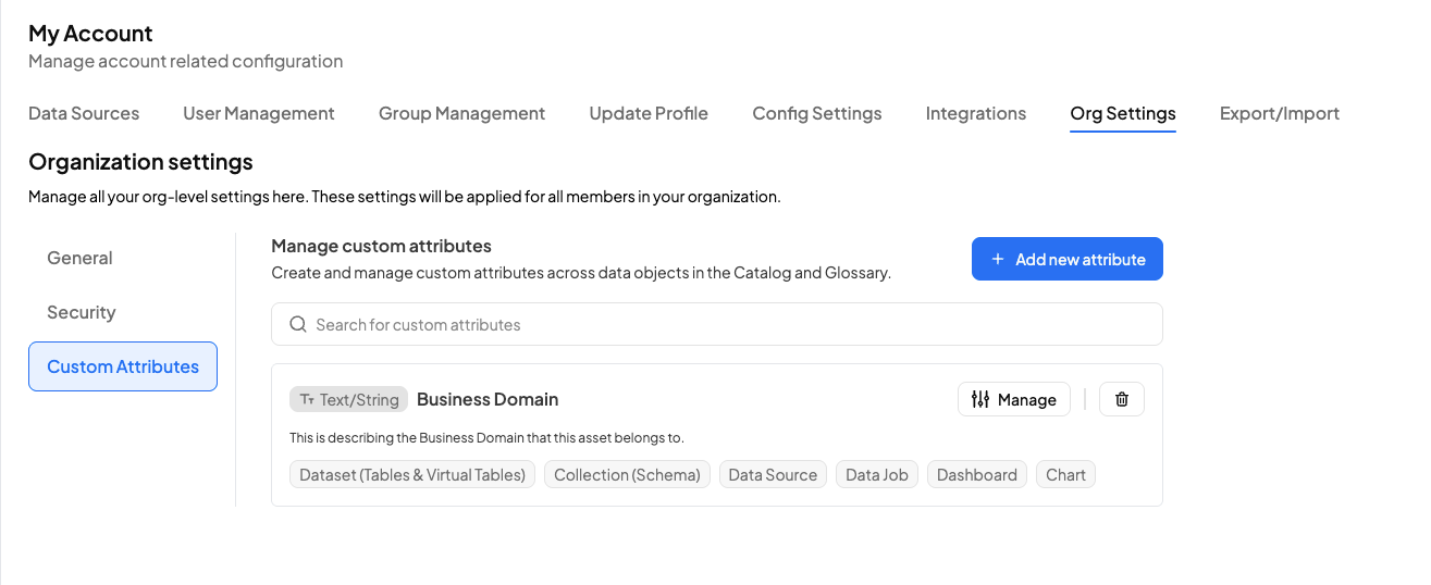 Custom attributes let your organization attach business-specific metadata to catalog assets. Admins create and manage attributes at the organization level and then users with asset edit permissions can apply those attributes to catalog objects.