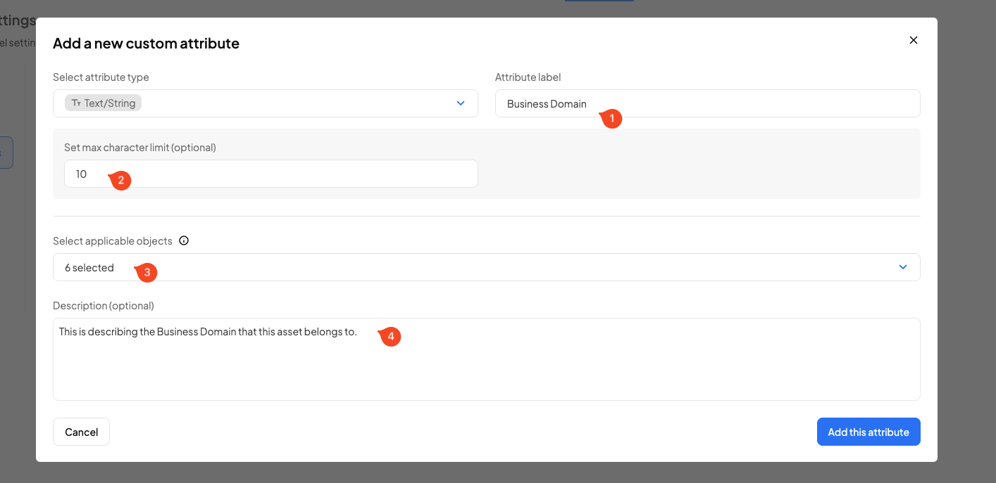 * Applicable asset types: Choose which catalog object types this attribute may be applied to (e.g., Dataset, Table, Column, Dashboard).