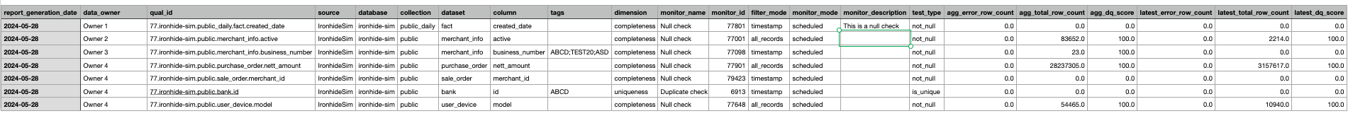 The output of the report will show the report based on each monitor that was enabled based on the time period selected. For example, if you had enabled a Not Null monitor on a column, it will show the DQ score for the monitor for the selected time period.