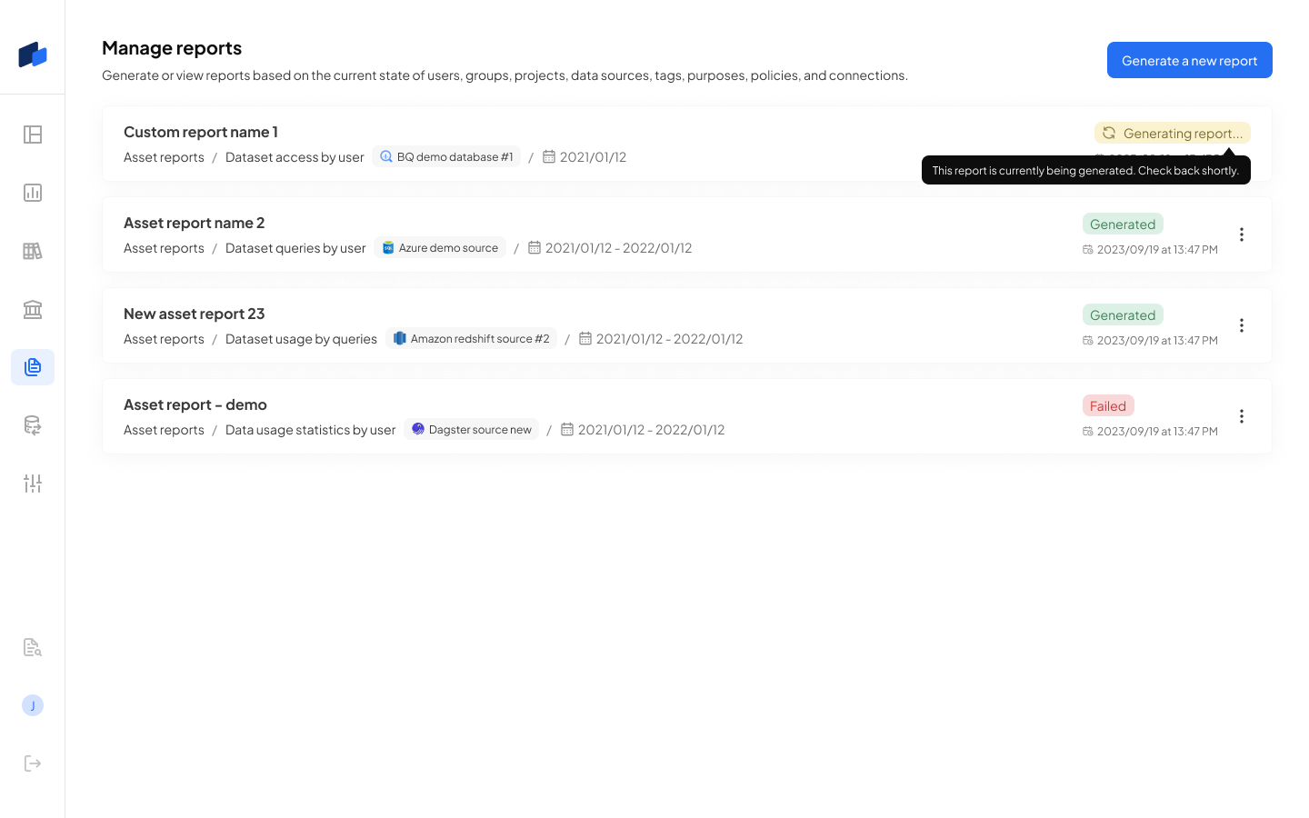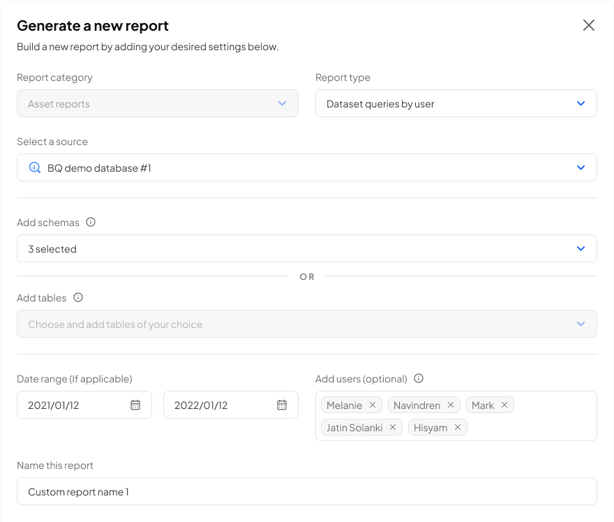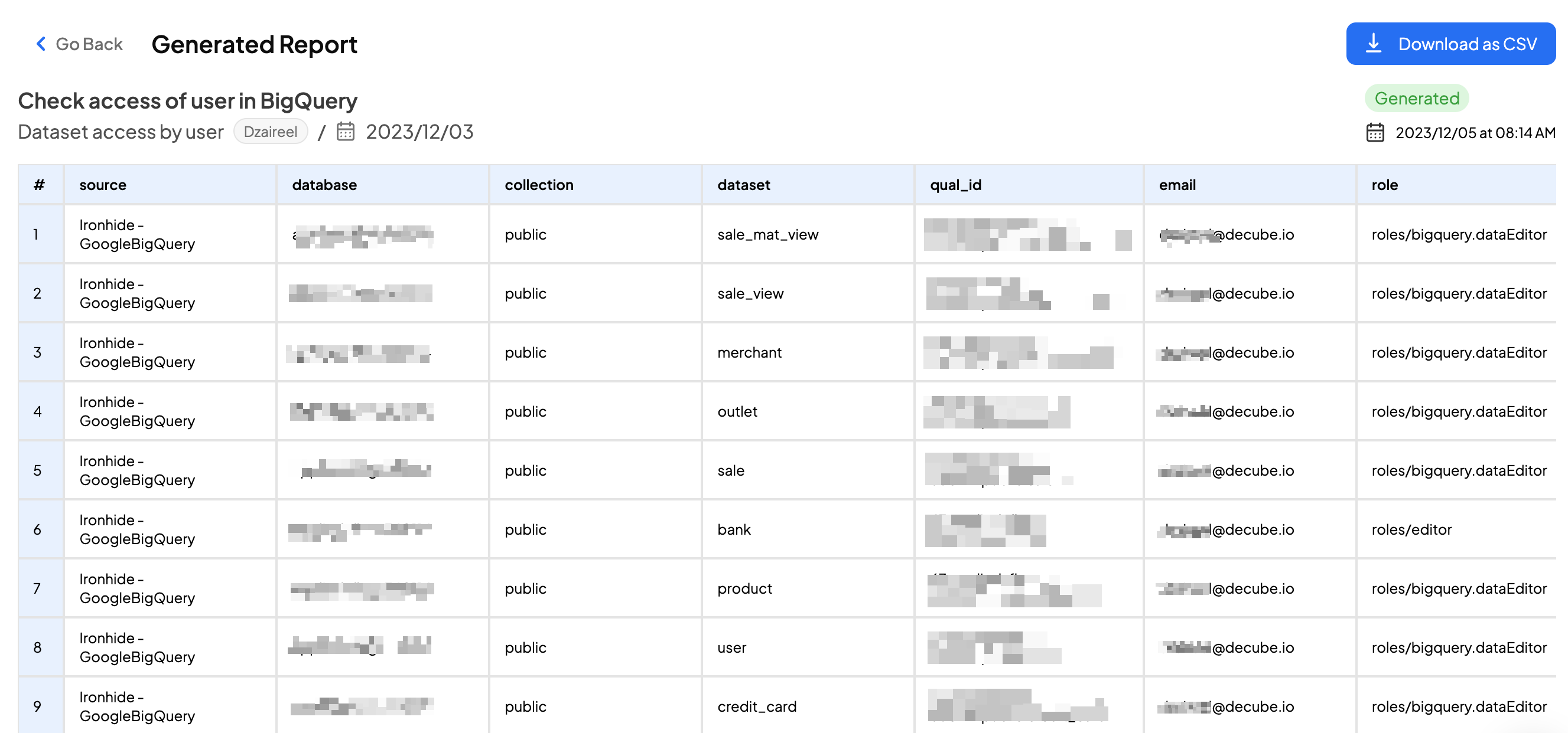 You can now generate and export reports on usage analytics through the Decube platform. For example, if you want to check which users have access to certain datasets within your connected data source, you can now generate a report to see a list of all the user emails that have access to those datasets and the roles of these users.