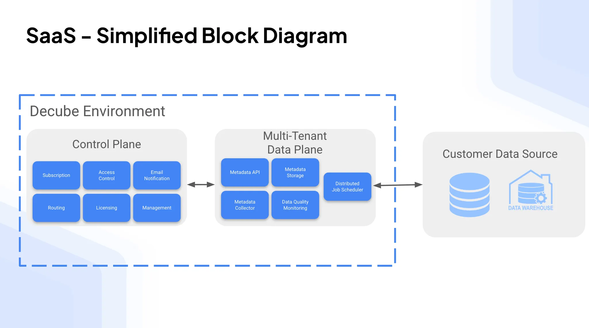 In this model, both the control and data planes are hosted and managed by Decube, and shared across multiple customers. Customers connect their data sources securely to enable metadata collection and observability.