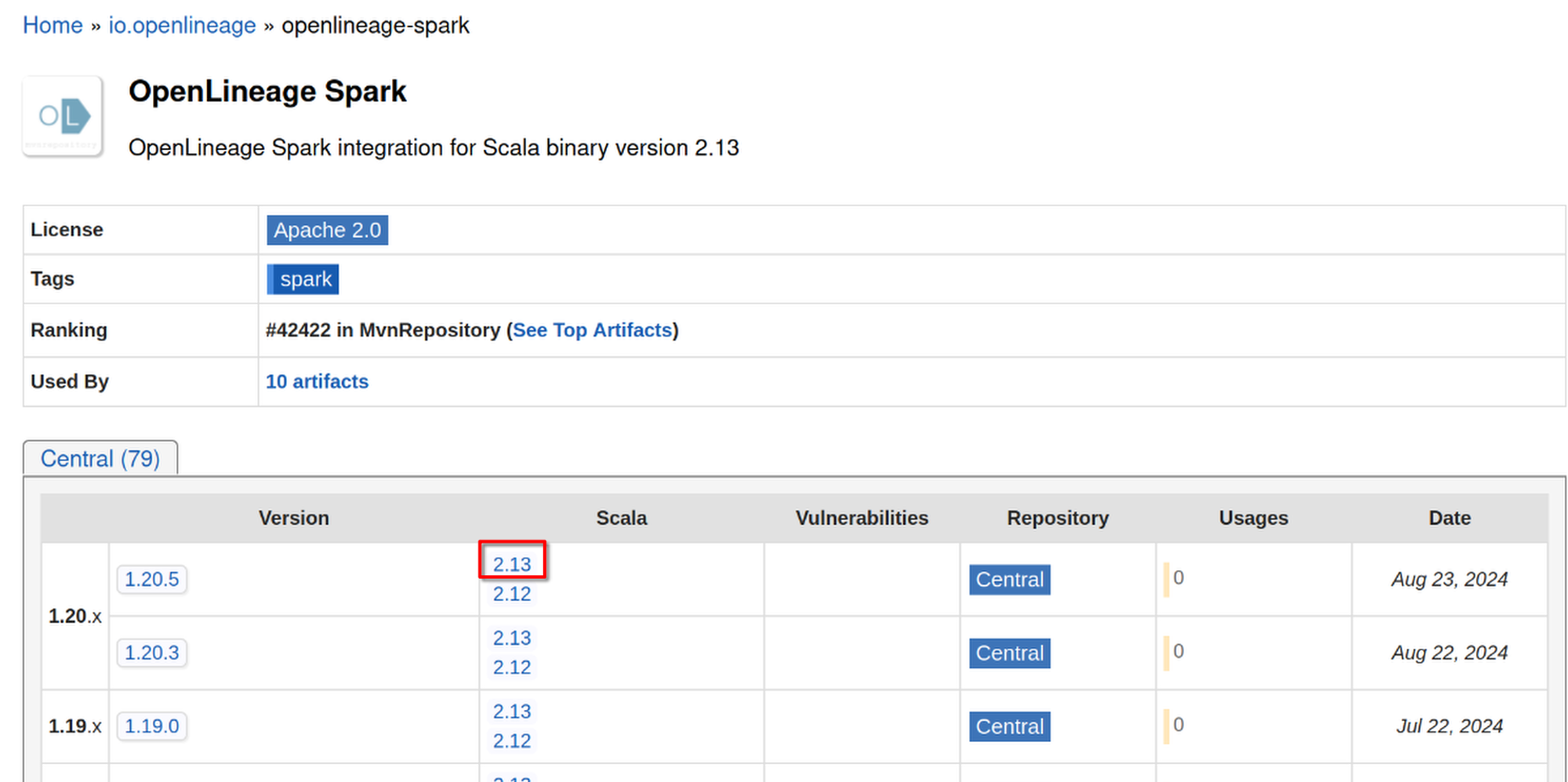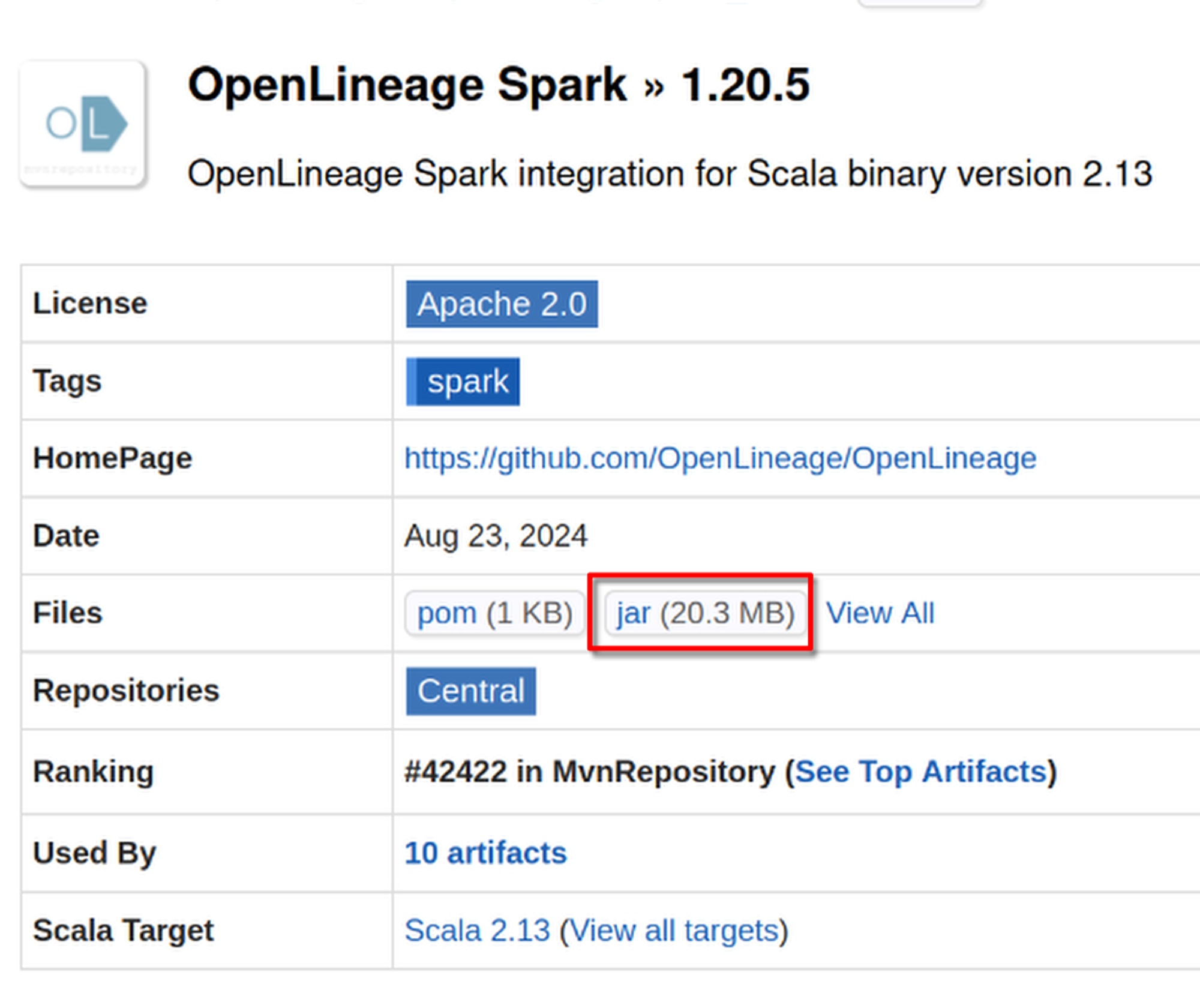 Navigate to the <https://mvnrepository.com/artifact/io.openlineage/openlineage-spark> and download the appropriate version of the OpenLineage binary. For most use cases, the version 1.20.5 - Scala 2.13 is recommended.