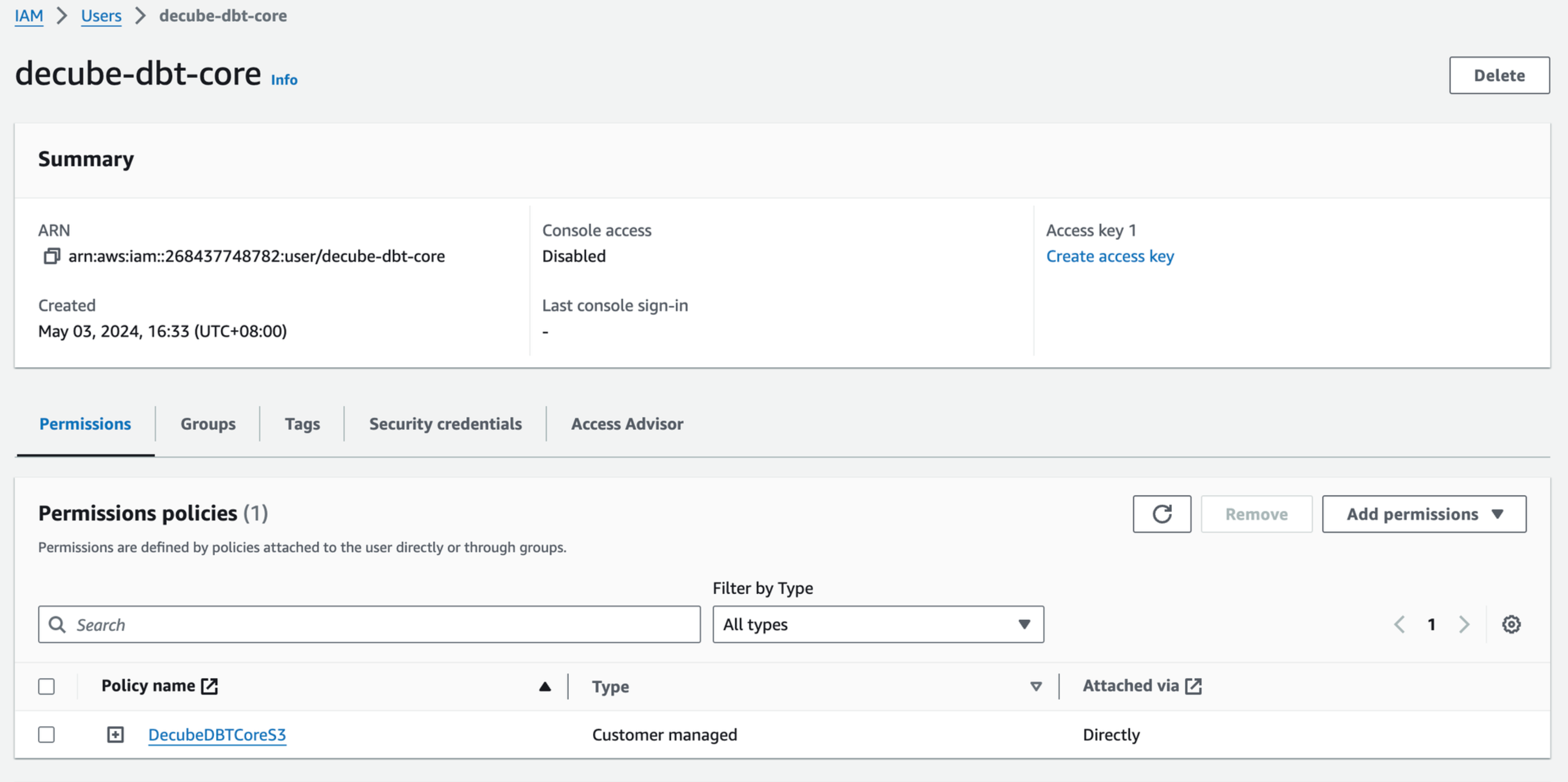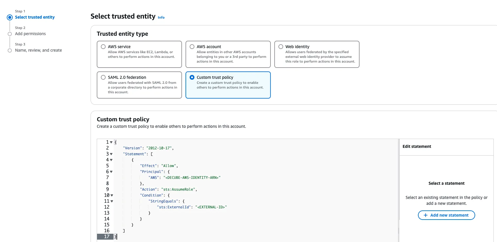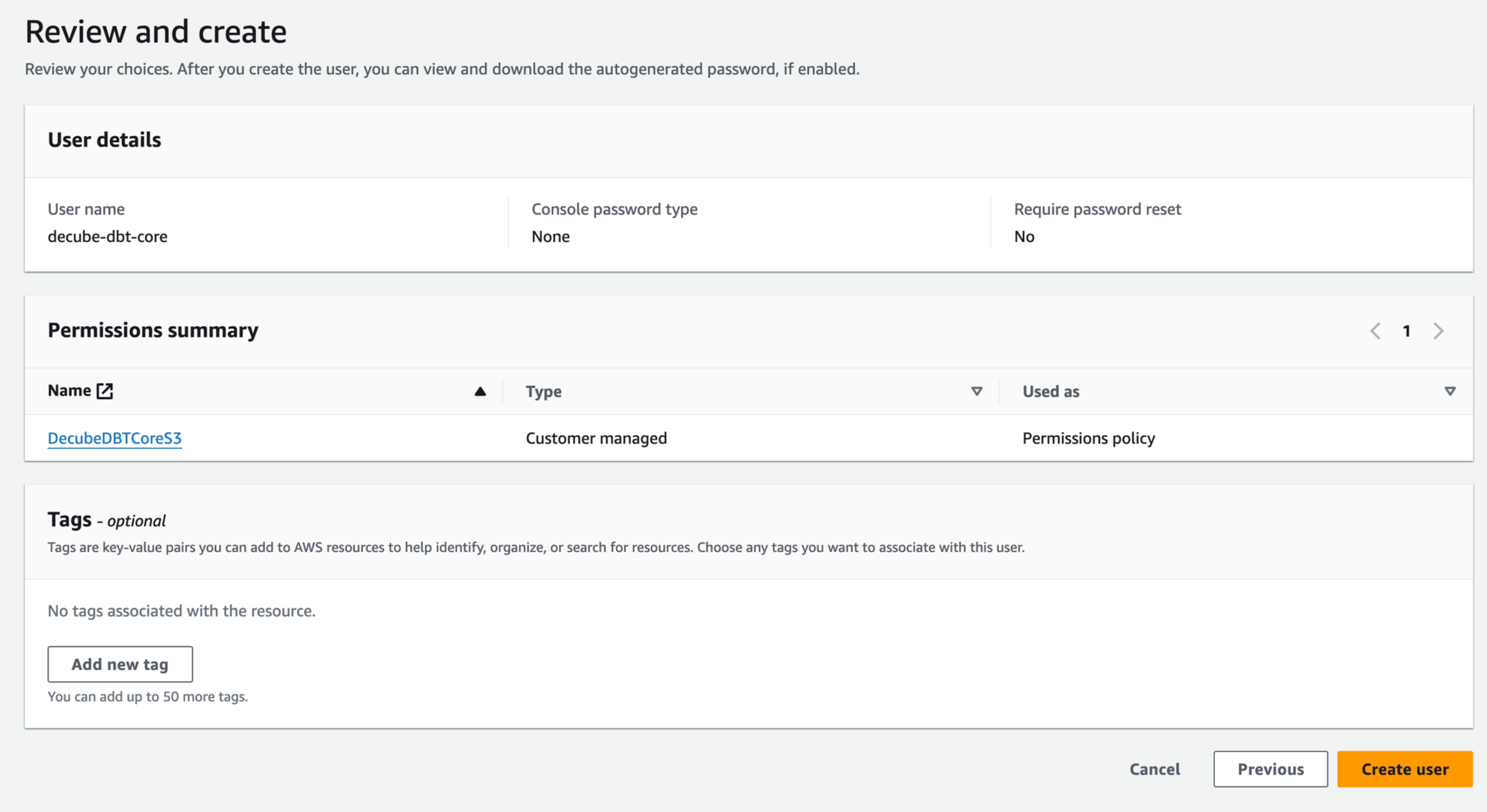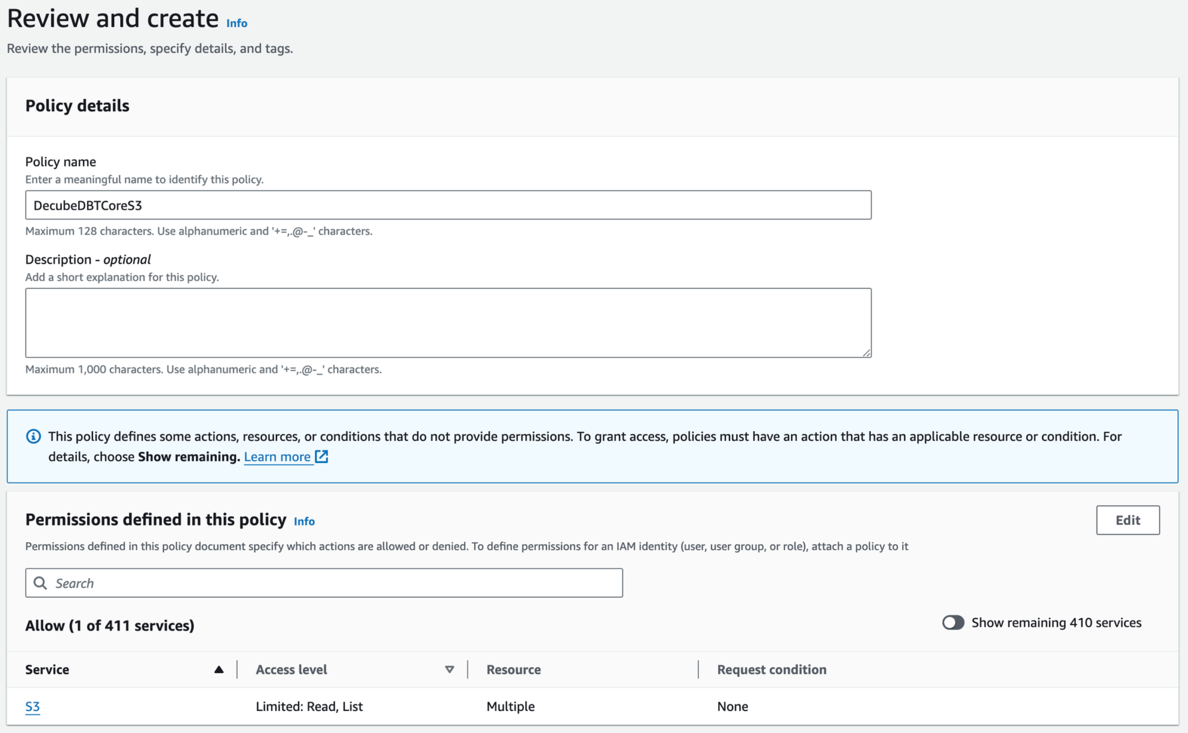 DECUBE-AWS-IDENTITY-ARNandEXTERNAL-IDwith values from Generating a Decube AWS Identity.