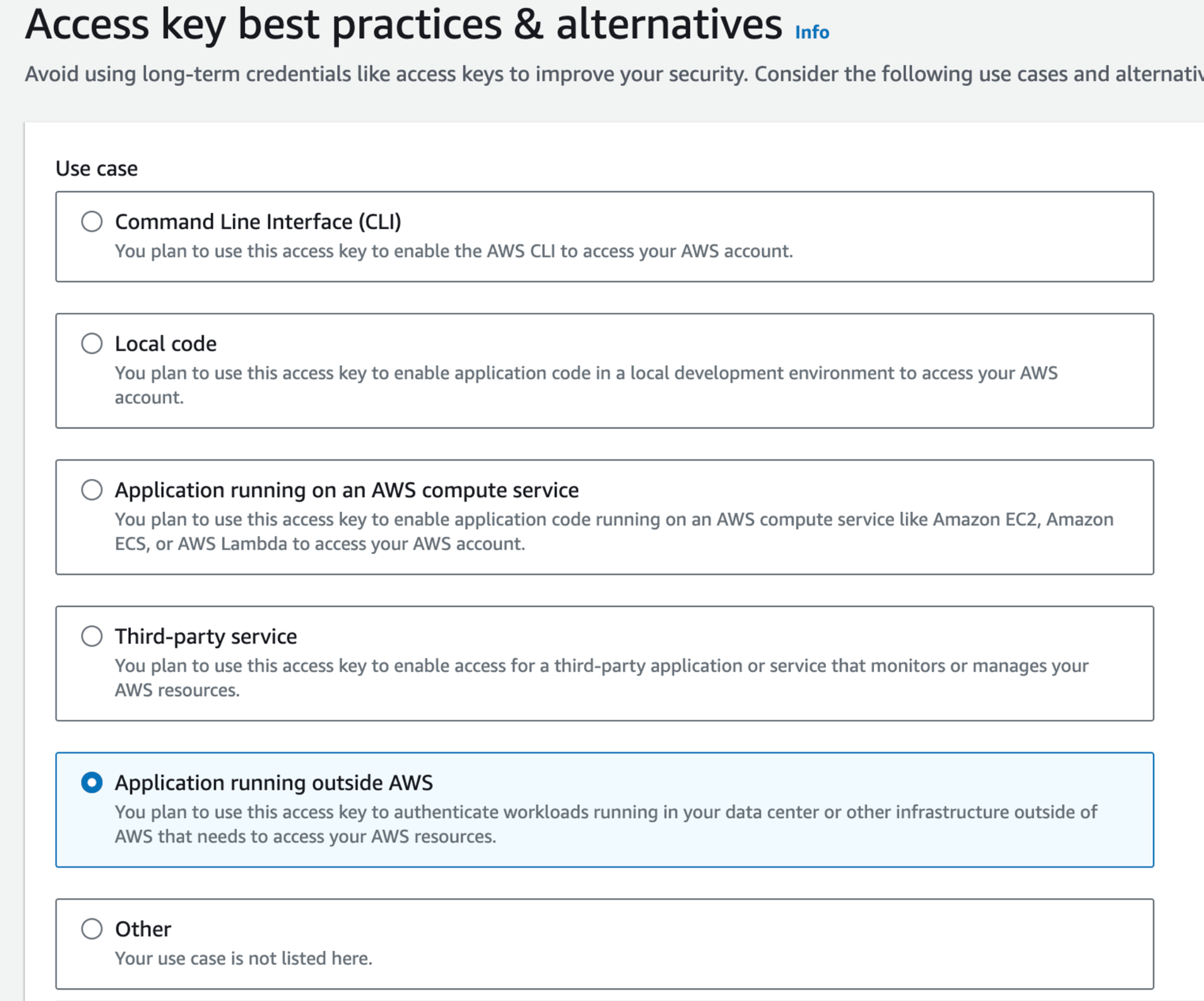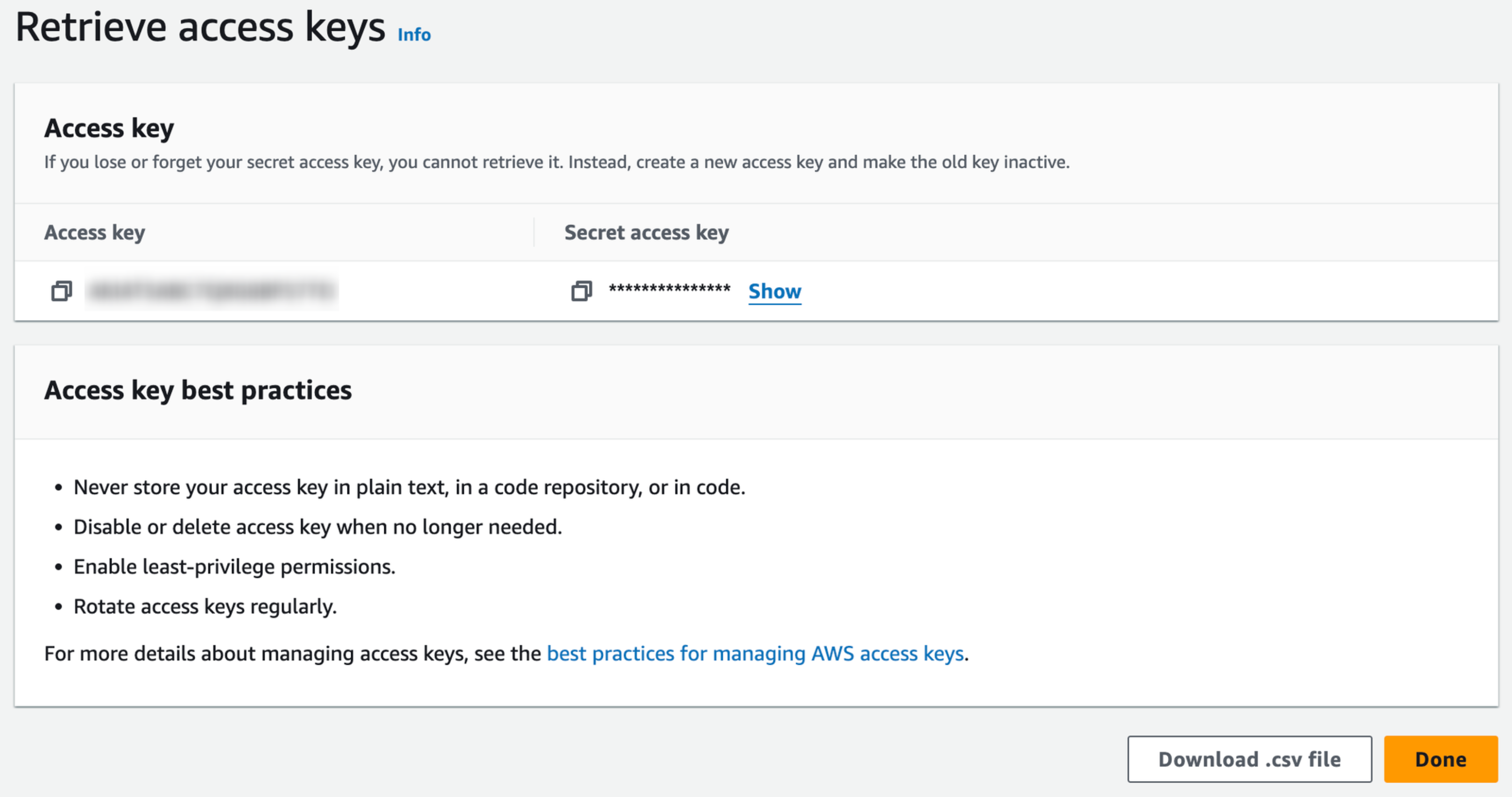 Step 6: Save the provided access key and secret access key. You will not be able to retrieve these keys again.
