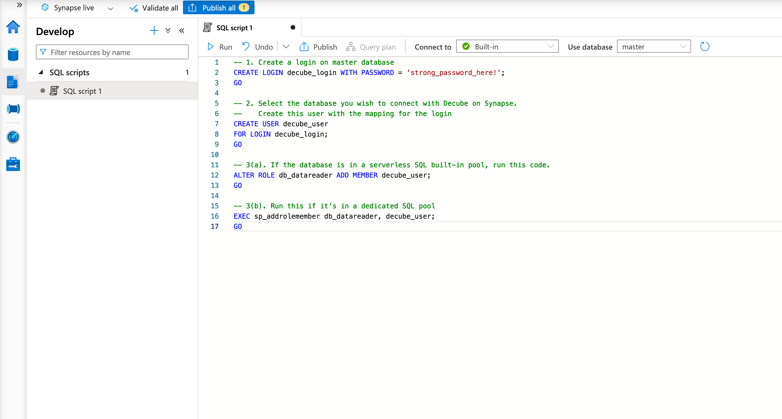 1. Select the master database on the `Use database` drop-down and create this login, we recommend calling it `decube_login` .